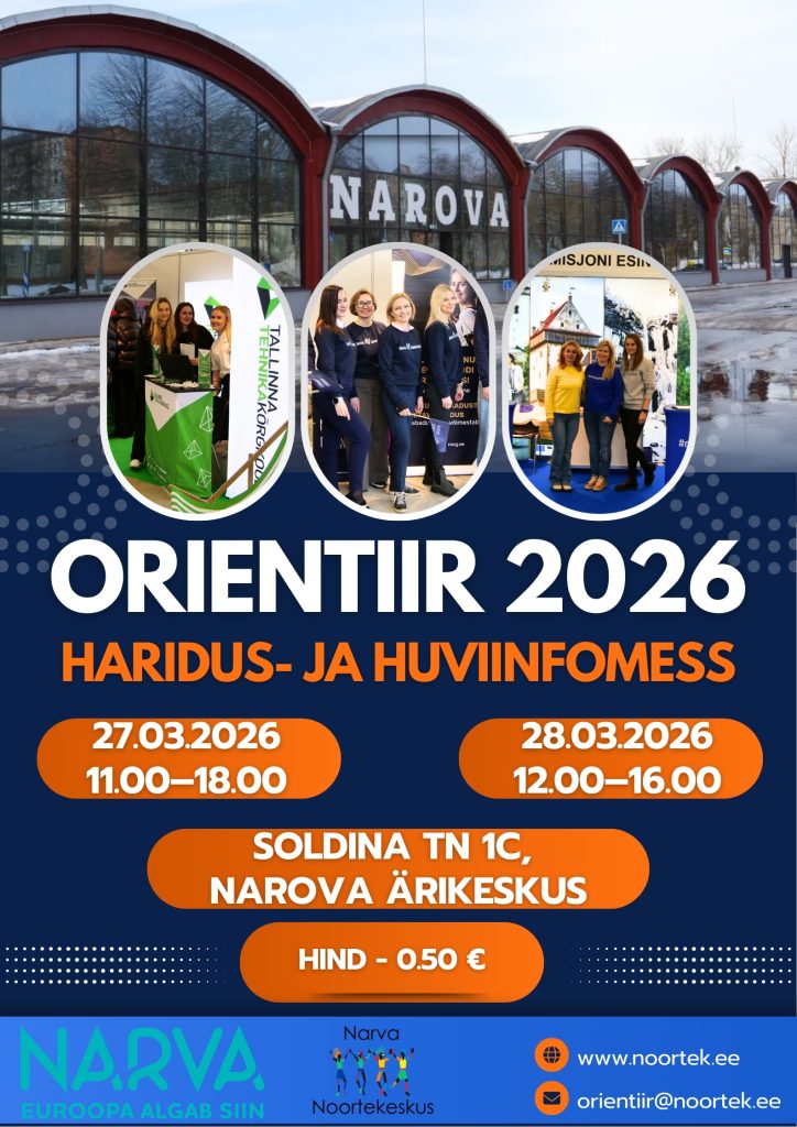 27.–28. märtsil 2026 toimub Narvas, Narova Ärikeskuse näitusepaviljonis (Soldina tn 1C) traditsiooniline haridus- ja huviinfomess „Orientiir“ – pikaajaline projekt, mida korraldab Narva Noortekeskus.