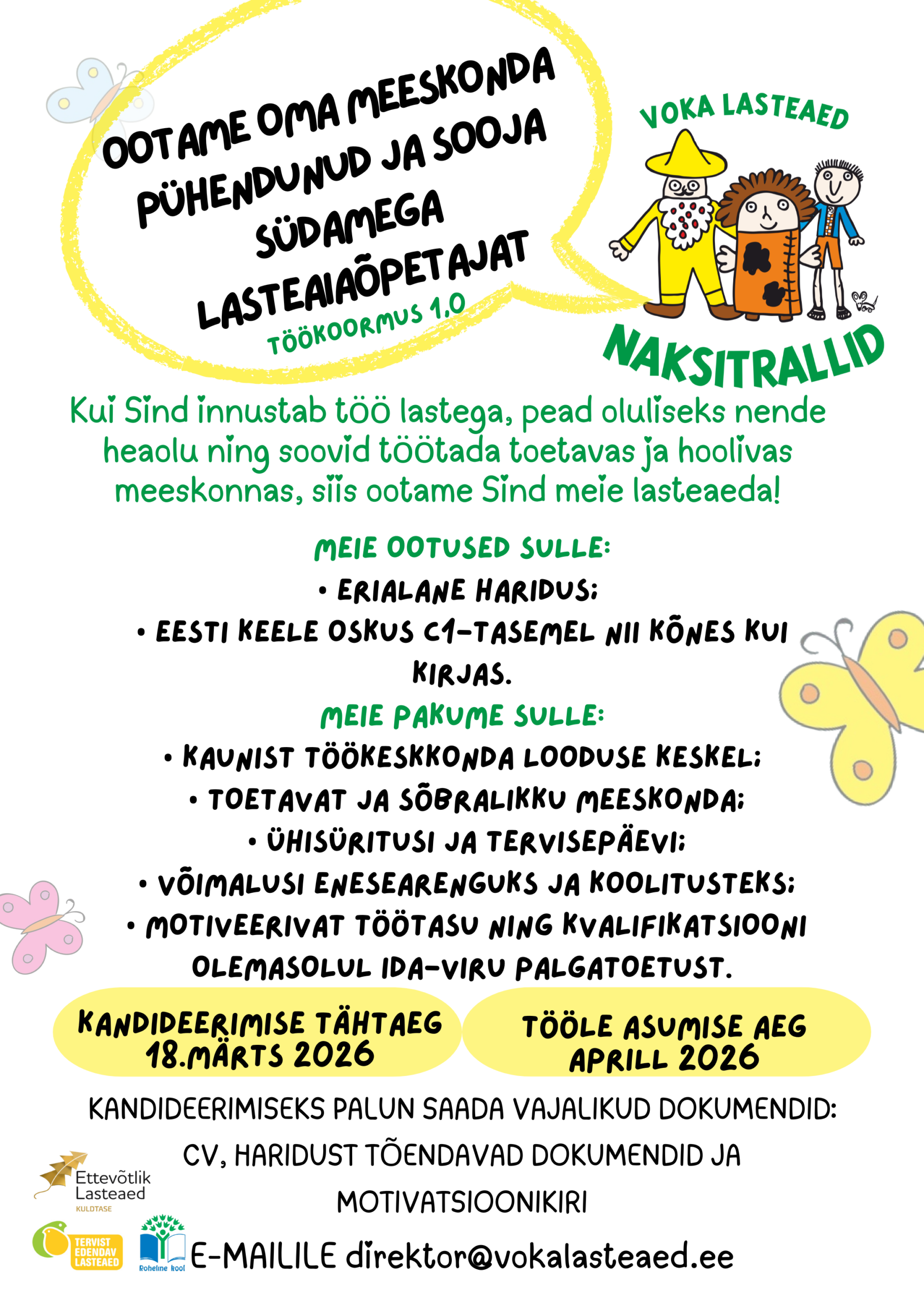 Voka Lasteaed Naksitrallid ootab oma meeskonda pühendunud ja sooja südamega lasteaiaõpetajat (töökoormus 1,0).